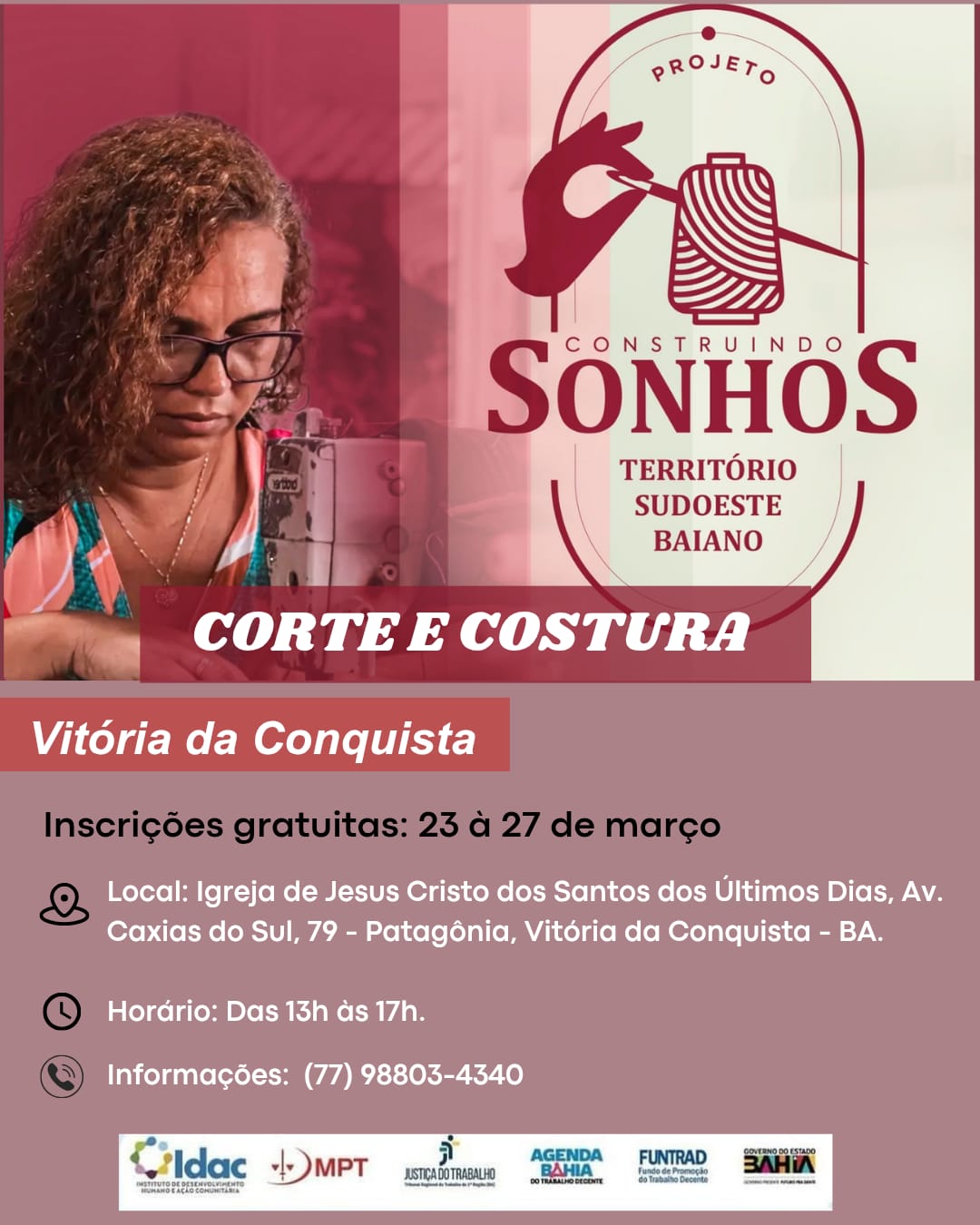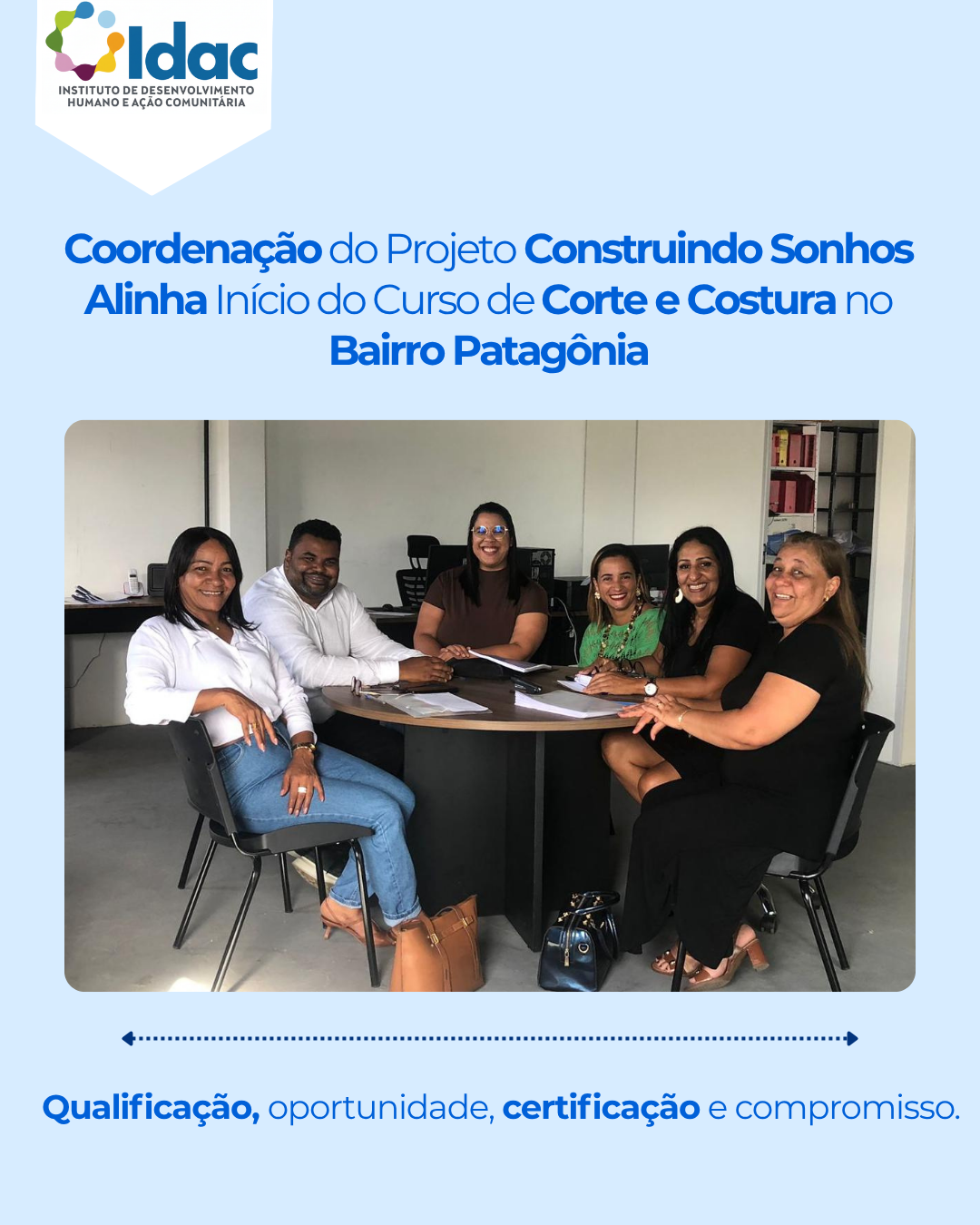 Na tarde de hoje, a coordenação do Projeto Construindo Sonhos no Território do Sudoeste Baiano – IDAC se reuniu com a equipe de trabalho do Curso de Corte e Costura do bairro Patagônia, que terá início na próxima quarta-feira, das 13h30 às 17h30.